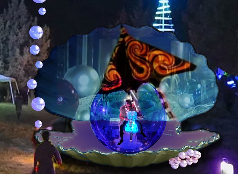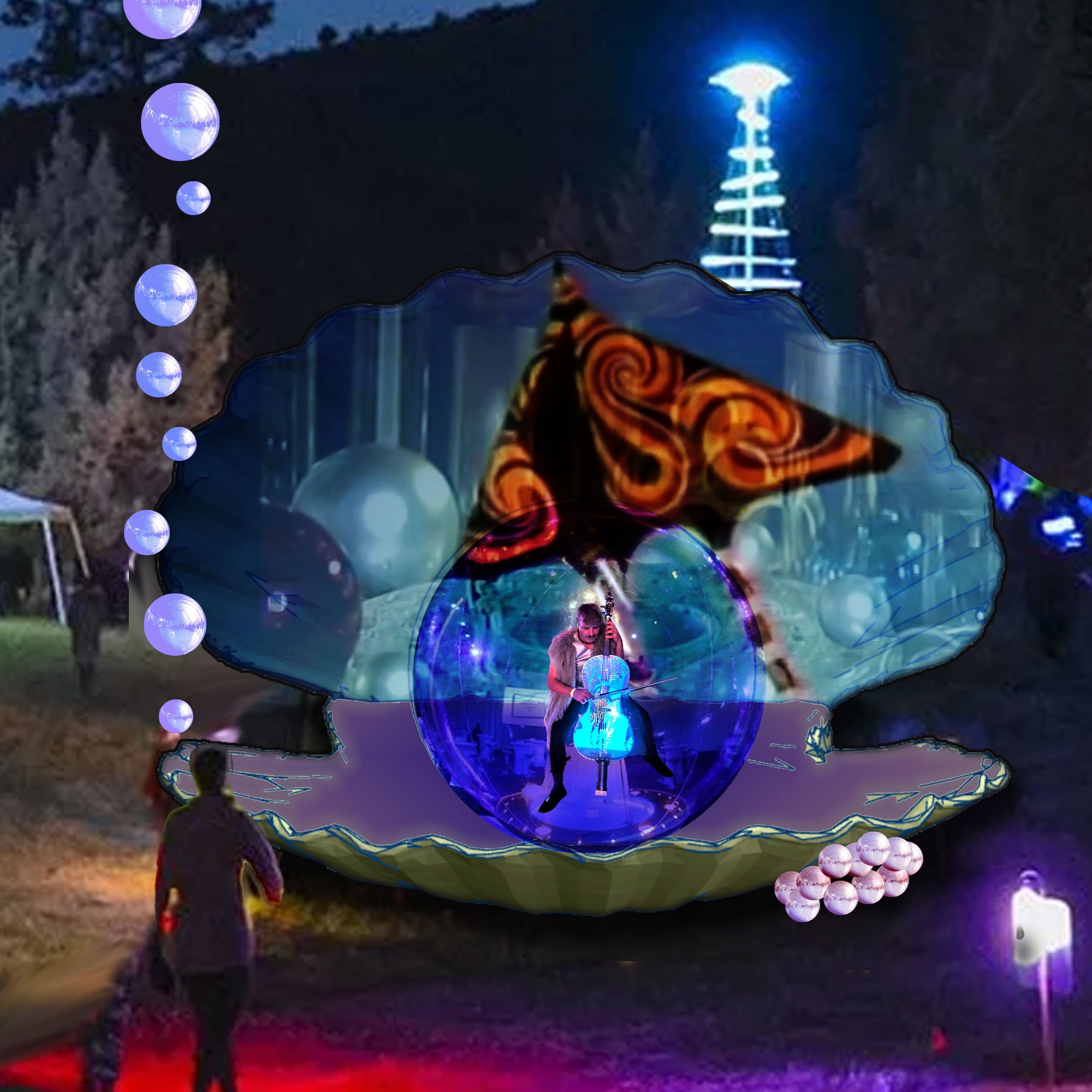 Arcida is proposed art project for 2026, a giant mollusk sound stage/art installation. In Arcida’s open shell stands The Pearl, a portal and oracle of the Muses. From within, our Avatars (DJs/performers) will share the Muses songs, and when the portal is closed the pearl transforms into an oracle, displaying mystical holographic communications from within its bubble.