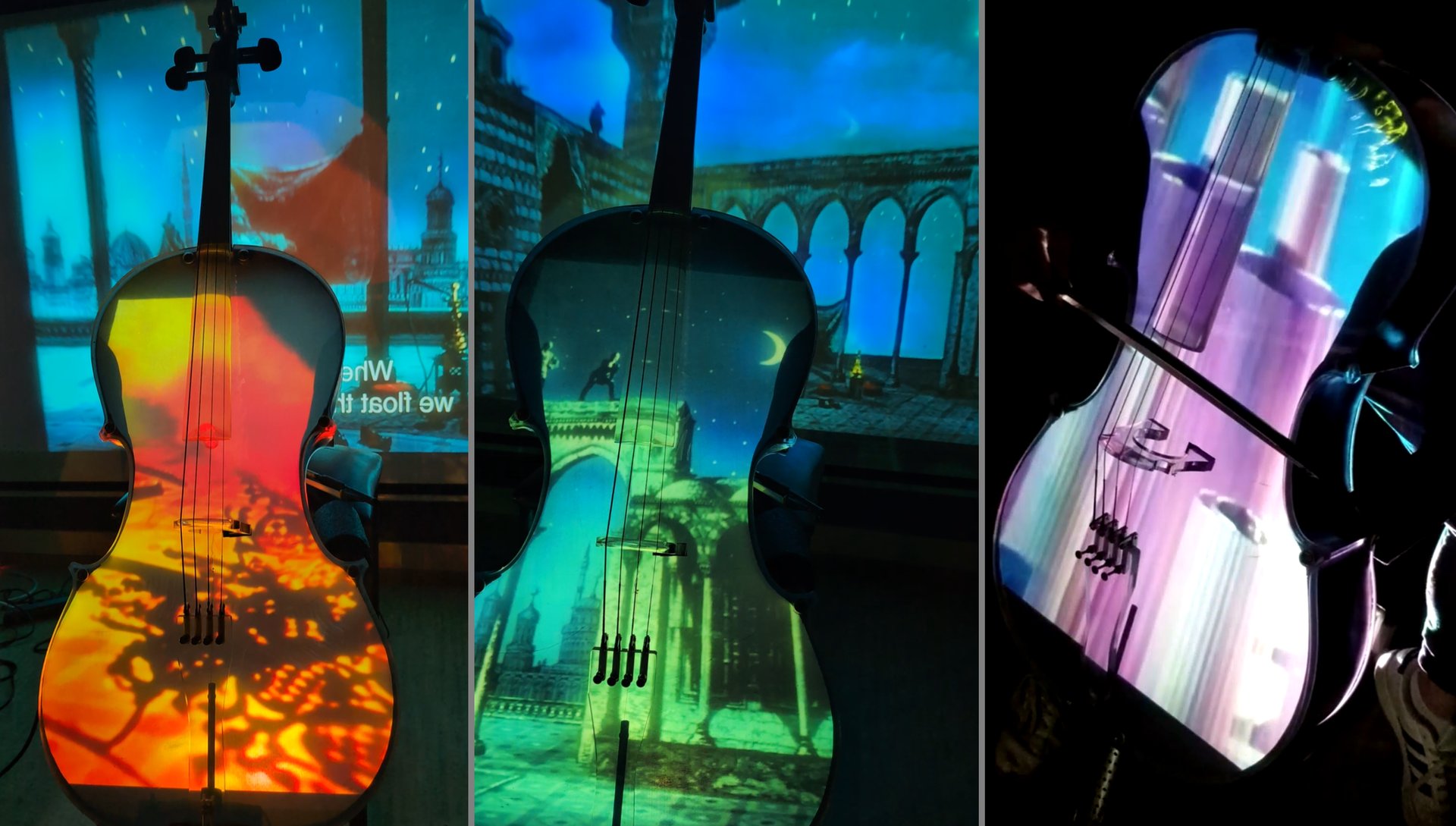 Cellographic is a cello reconstructed in translucent acrylic with integrated video projection. Serving as a semi-transparent screen for animated imagery layered over background projections, it offers a groundbreaking yet familiar form of live entertainment that evokes the aesthetics of traditional cell animation.
